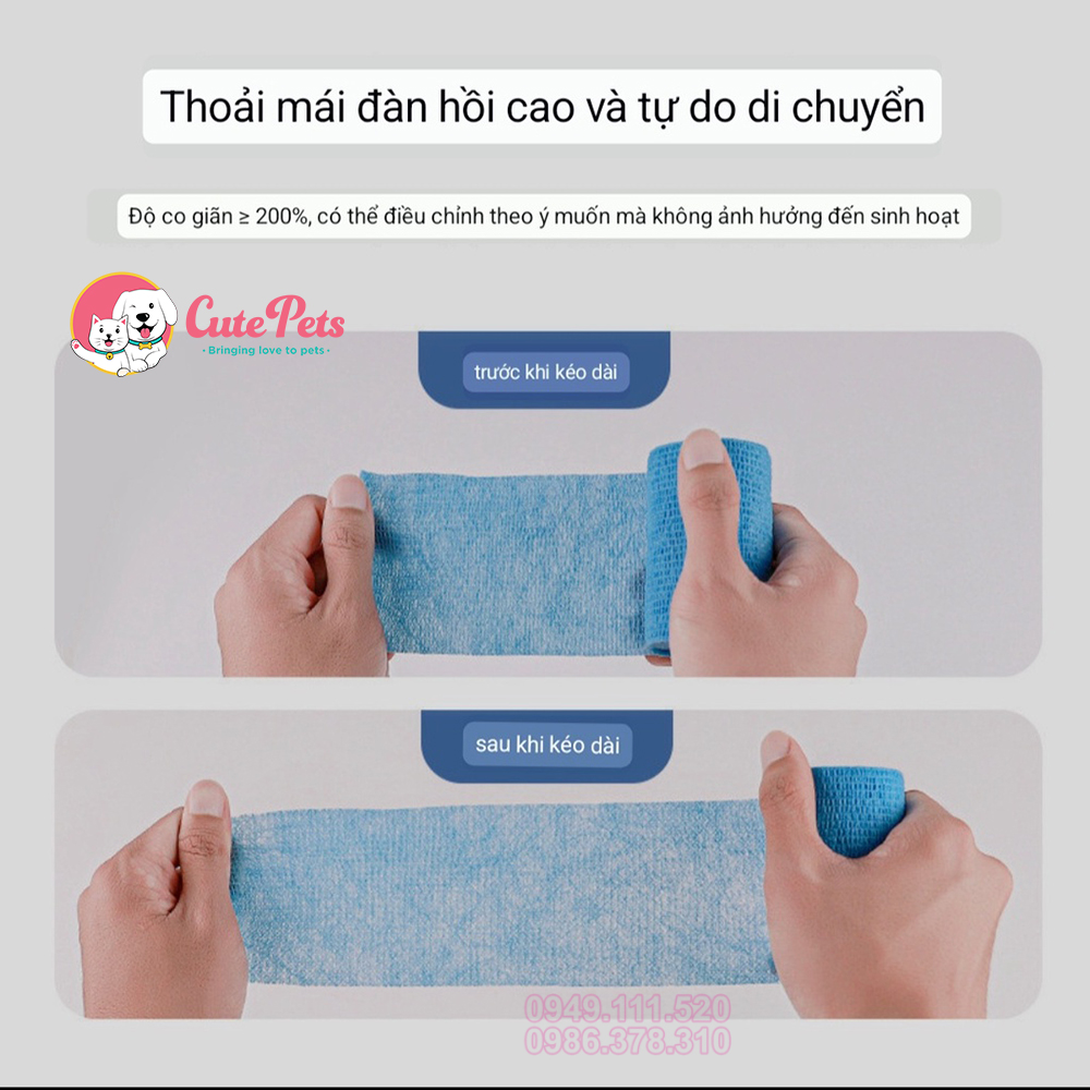 Băng có thẻ tư dính không cần kẹp hay dùng keo dán. Quấn bảo vệ vết thương cho thú cưng hoặc có thể thay cho chiếc giày, quấn các chân cho bé thoải mái chạy nhảy mà không sợ dơ.