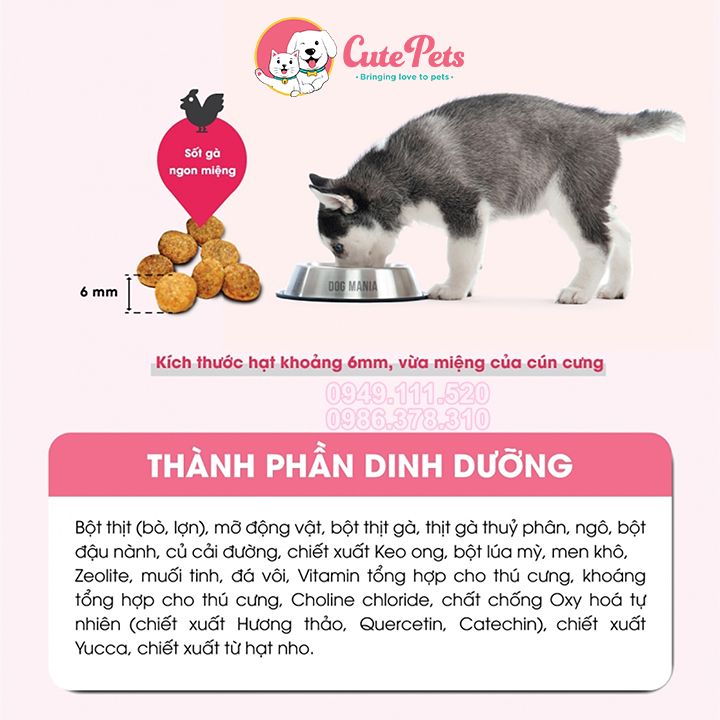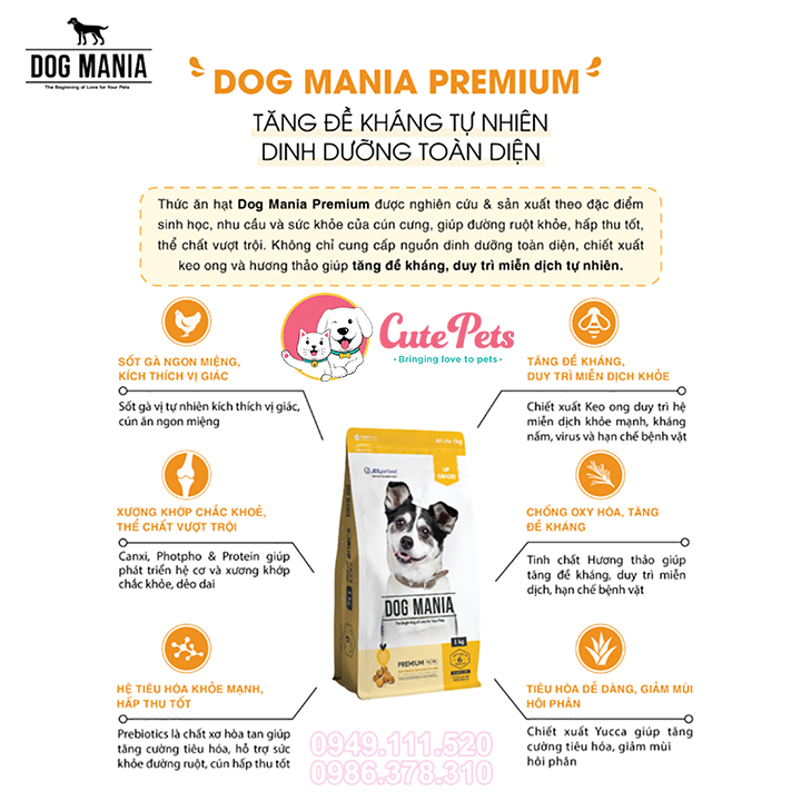 Thức ăn hạt dinh dưỡng cho chó Dog Mania giúp hấp thu tốt, phát triển hệ cơ xương khớp khỏe mạnh trong năm đầu đời. Không chỉ cung cấp nguồn dinh dưỡng toàn diện, chiết xuất keo ong và hương thảo giúp tăng đề kháng, duy trì miễn dịch tự nhiên.