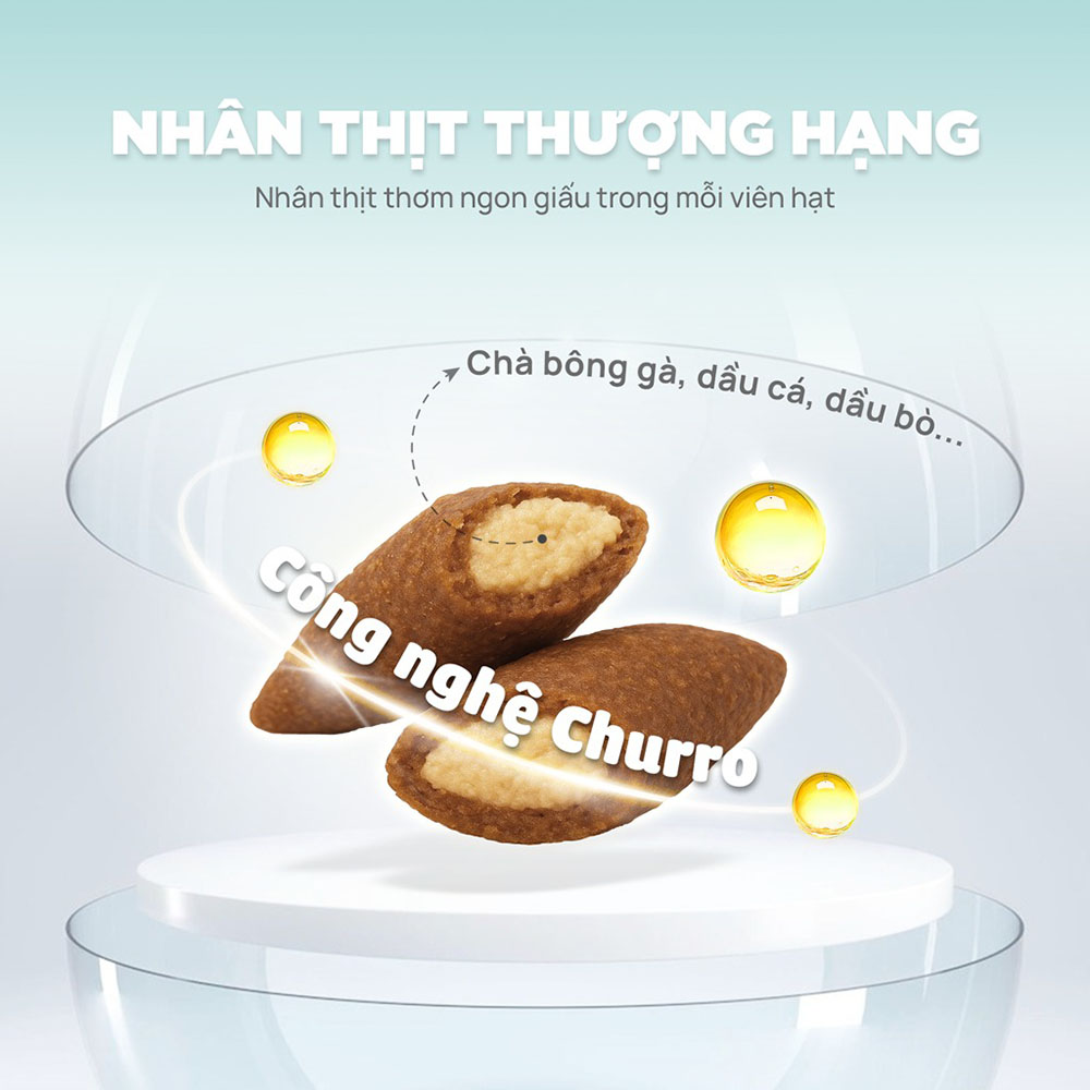 Nhân thịt thượng hạng bên trong hạt theo công nghệ “Churro” – giúp tăng hương thơm, vị ngon và kích thích mèo ăn ngon miệng.