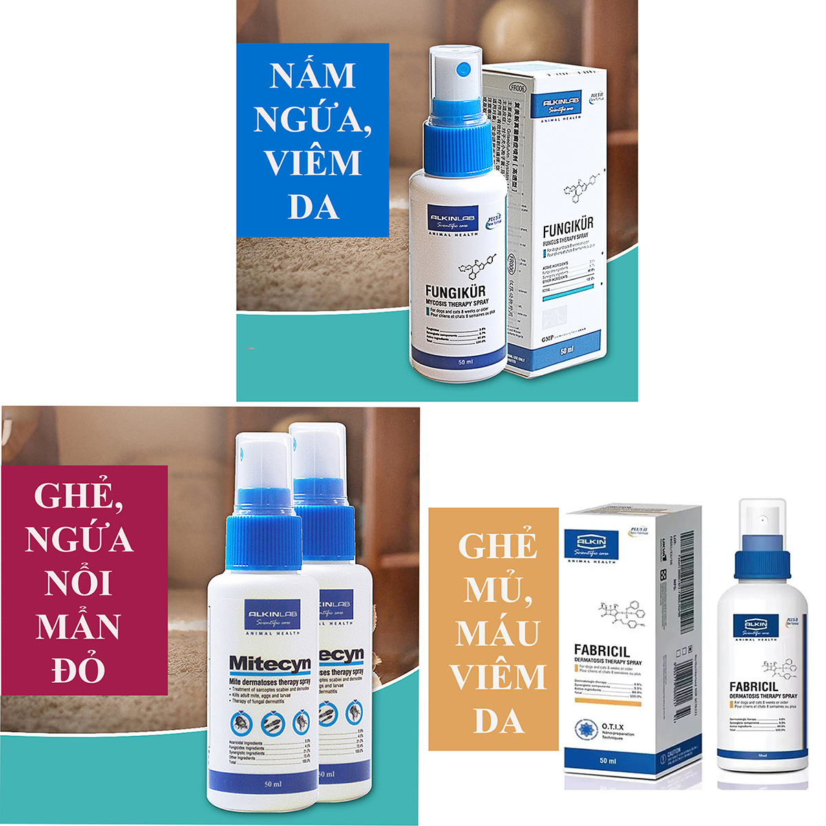 Xịt nấm ghẻ cho chó mèo Mitecyn ,Fungikur,Fabricil 50ml (viêm,ngứa,nổi mẩn ,ghẻ,vảy gàu)